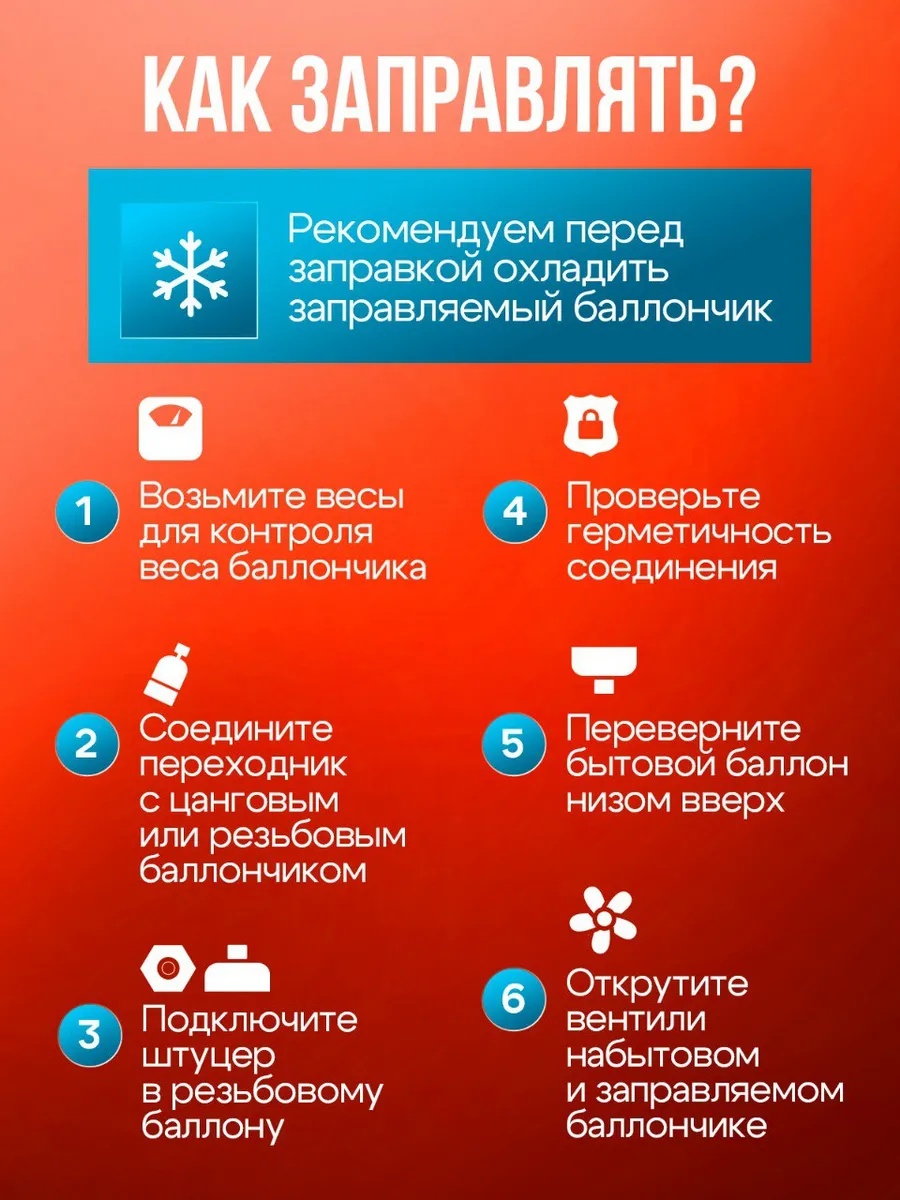 С помощью комплекта вы сможете заправлять цанговые баллончики от больших бытовых баллонов, существенно экономя деньги и время.